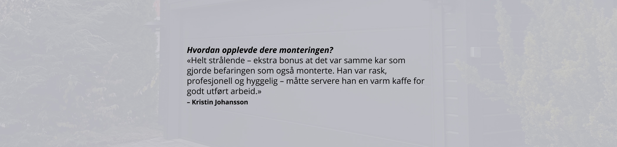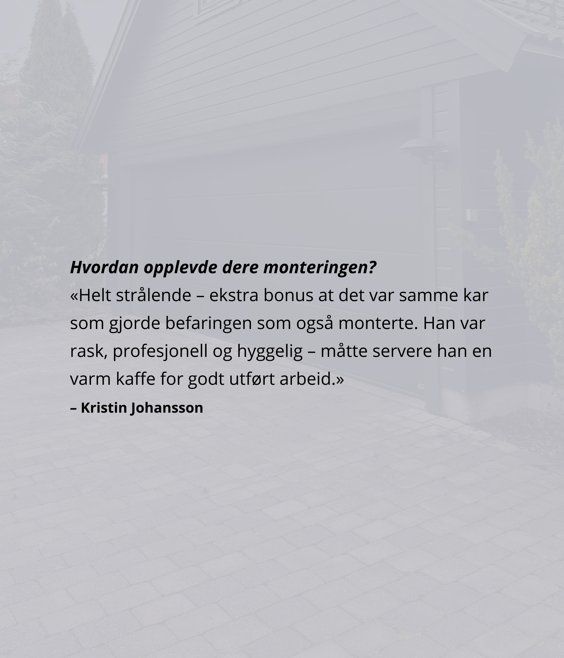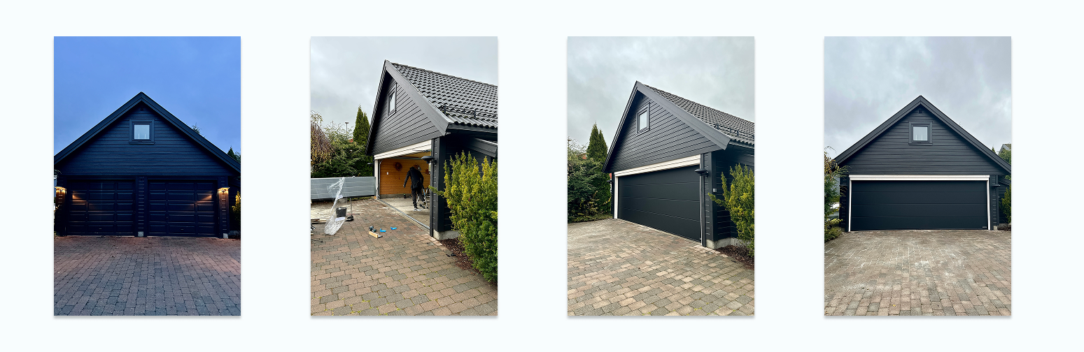Johansson er svært fornøyd med resultatet etter oppgraderingen. Overgangen fra to slitte porter til én større og mer moderne løsning har gitt både et løft i uttrykk og bedre funksjonalitet i hverdagen. Nedenfor kan du se bilder som viser tydelig forskjellen før og etter montering.
